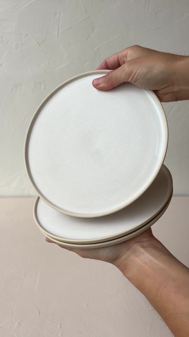 Keramisch dessert bord gemaakt van wit steengoed. De binnenkant is voorzien van wit mat glazuur, aan de buitenkant blijft de witte klei puur. Deze stuks werden op de draaischijf met de hand gedraaid, elk stuk is dus uniek.