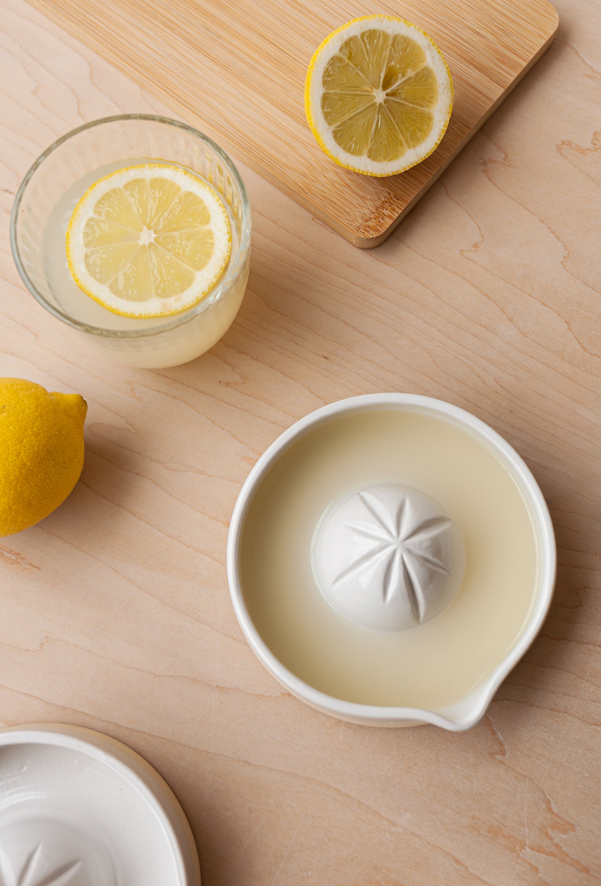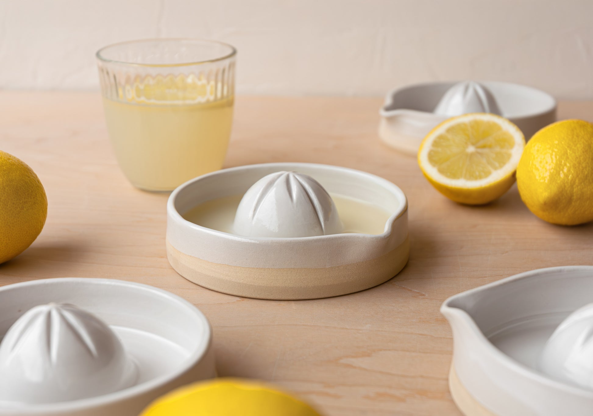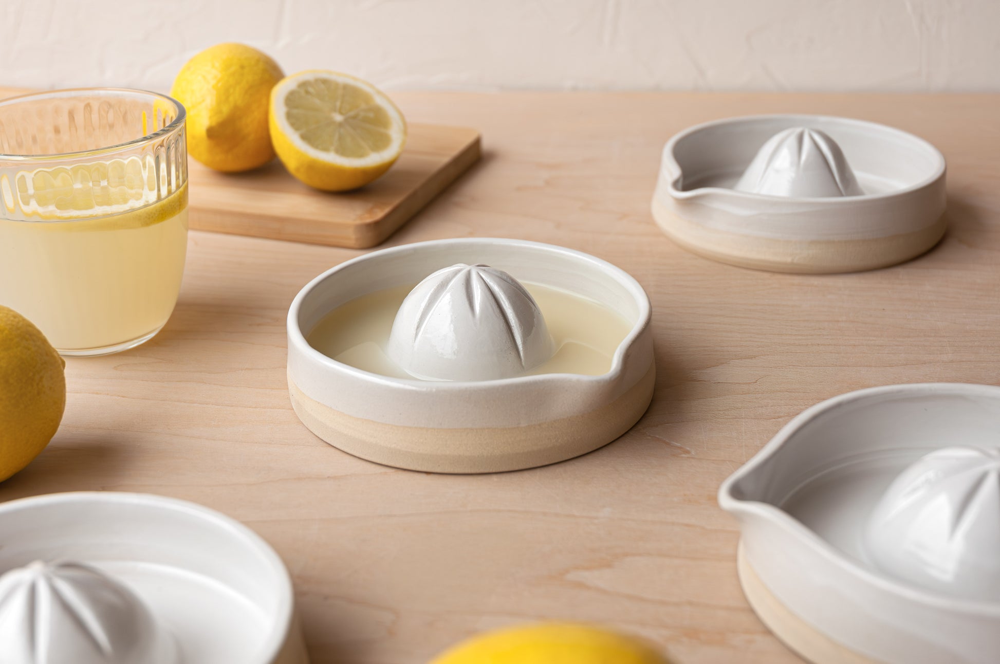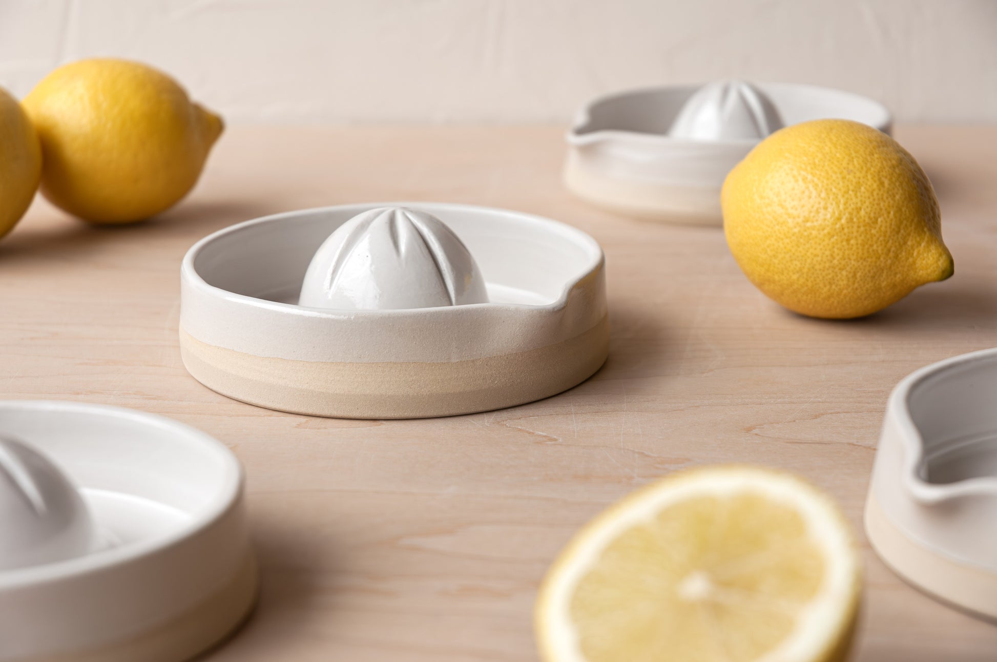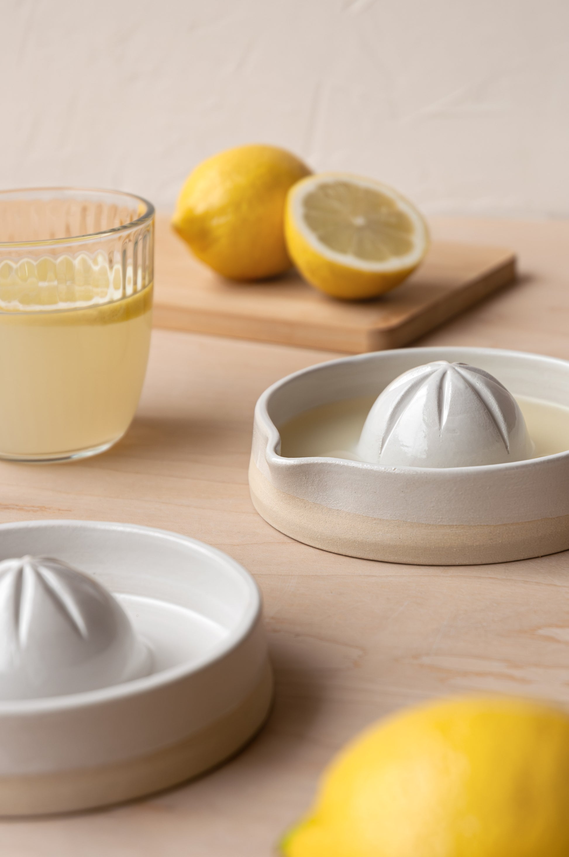 Handgemaakte keramische citruspers van witte klei, wit geglazuurd met handige gietteut. Deze stuks werden op de draaischijf met de hand gedraaid, elk stuk is dus uniek.