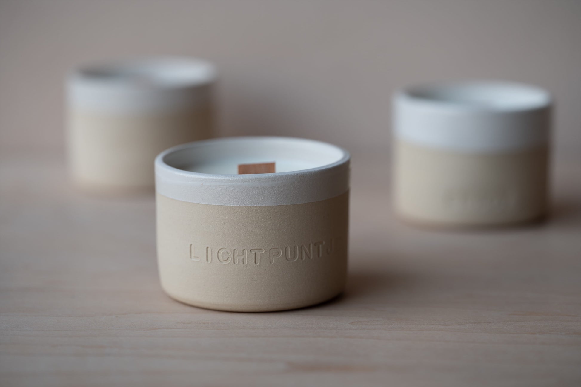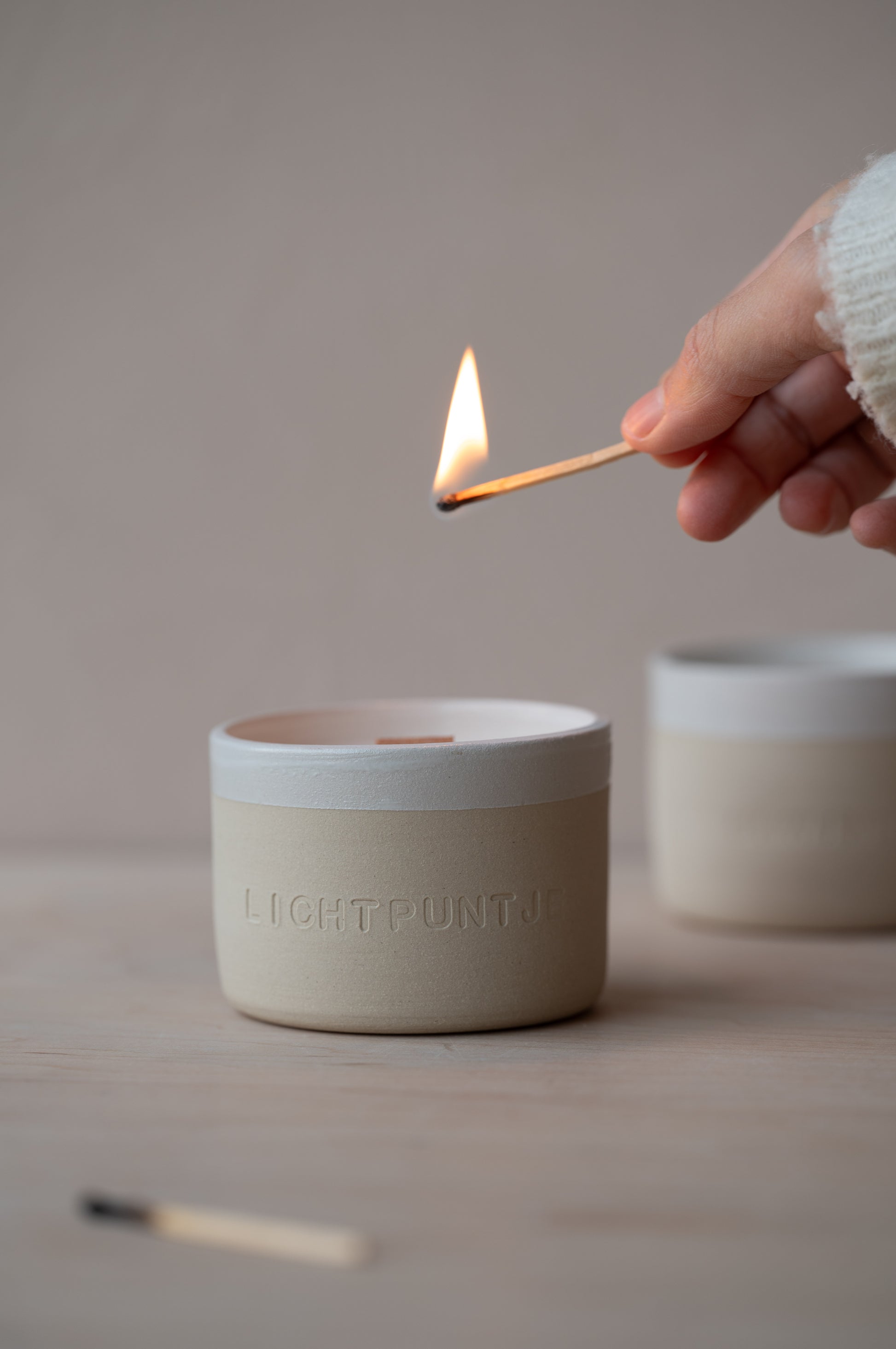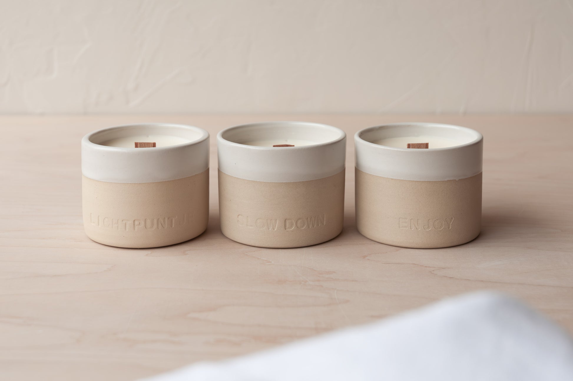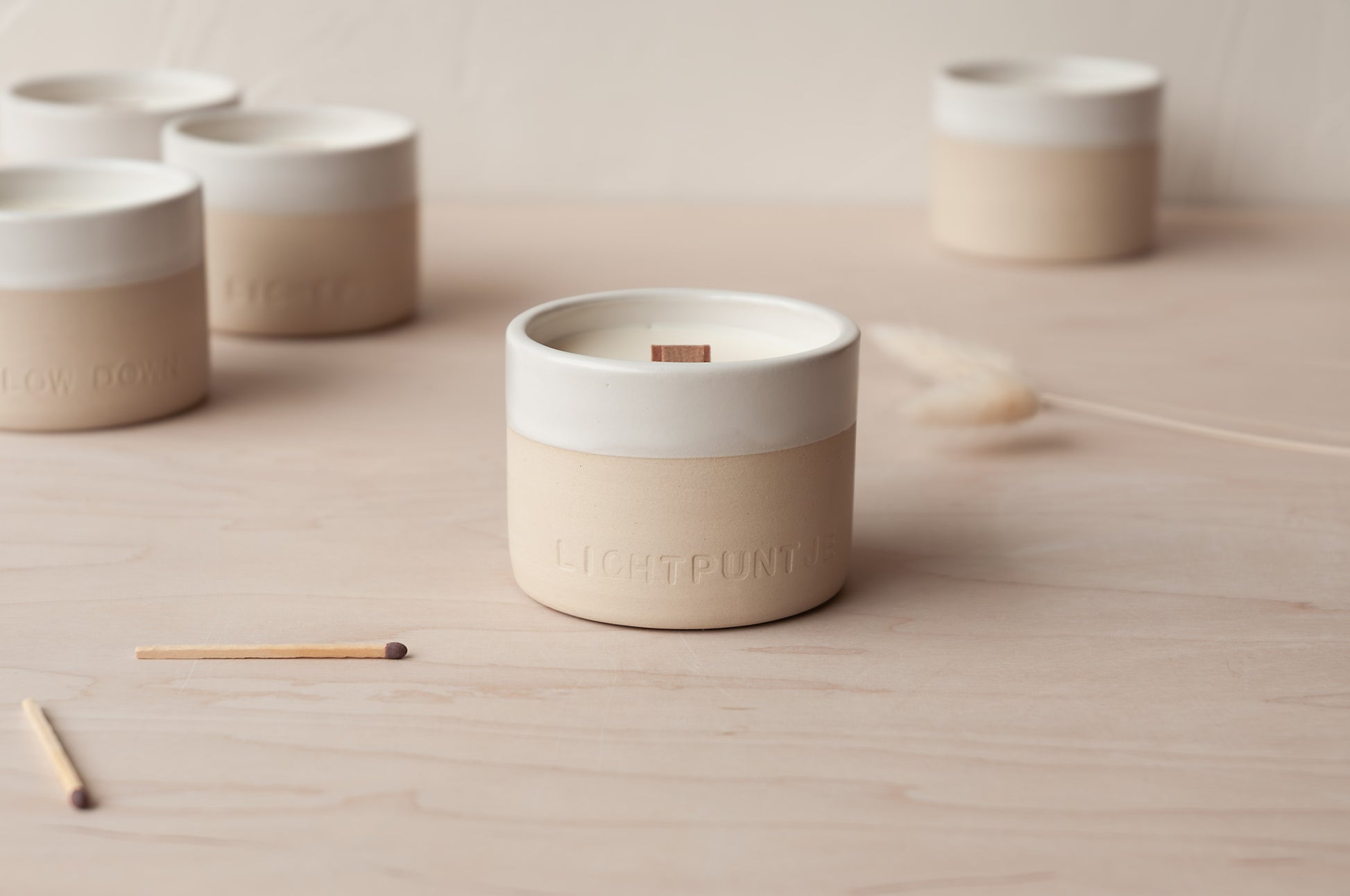 Kaars met houten lont in een handgemaakt keramiek potje. Op het potje staat een ingedrukte tekst. Er zijn 4 tekstjes om uit te kiezen: 'unwind', ‘enjoy’, ‘slow down’ en ‘lichtpuntje’. De potjes zijn gemaakt uit witte klei en voorzien van een witte voedselveilige glazuur. Enkele zijn in spikkelklei.