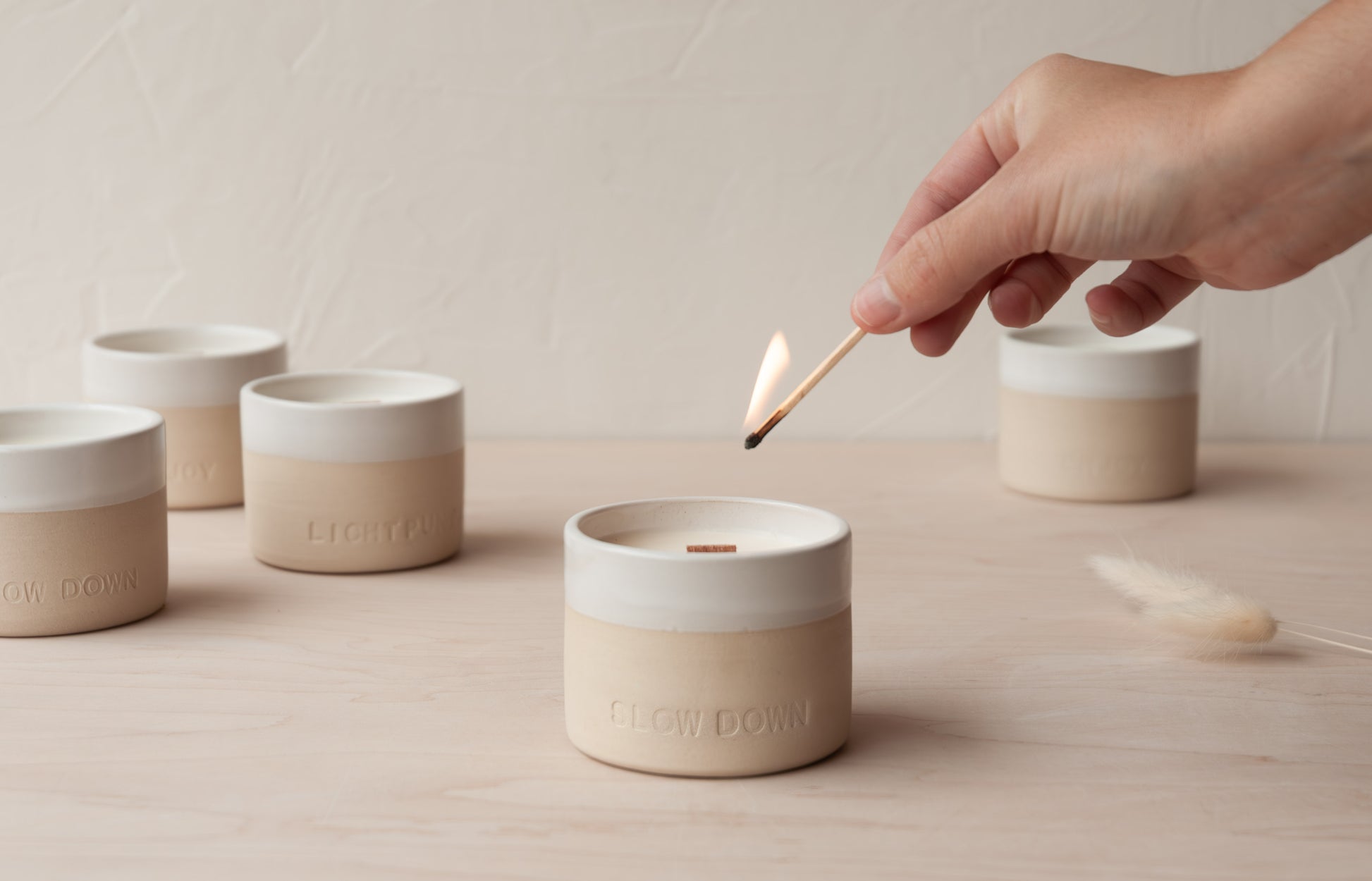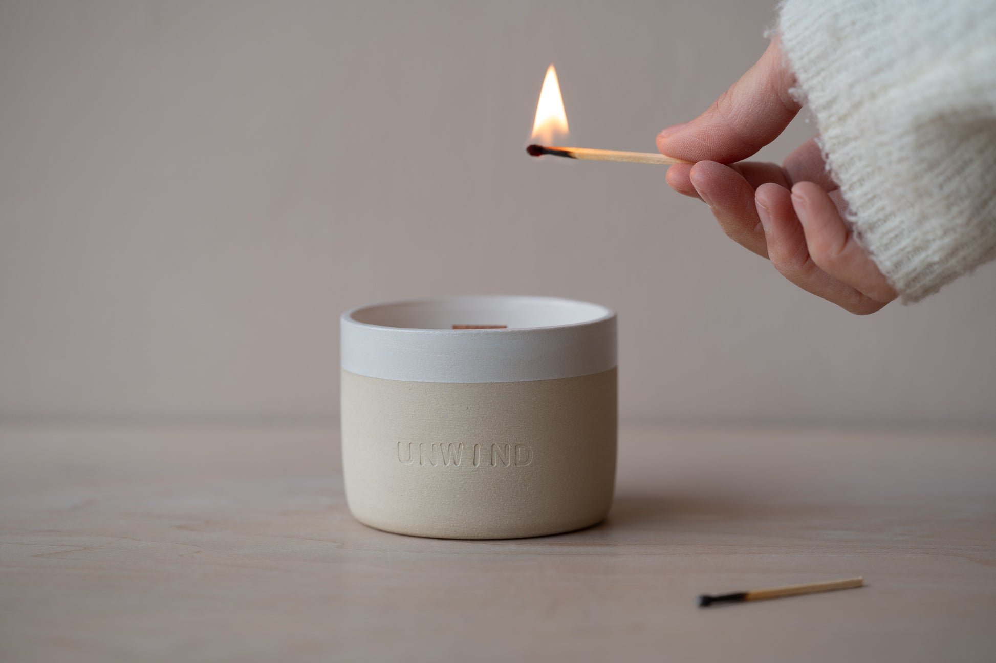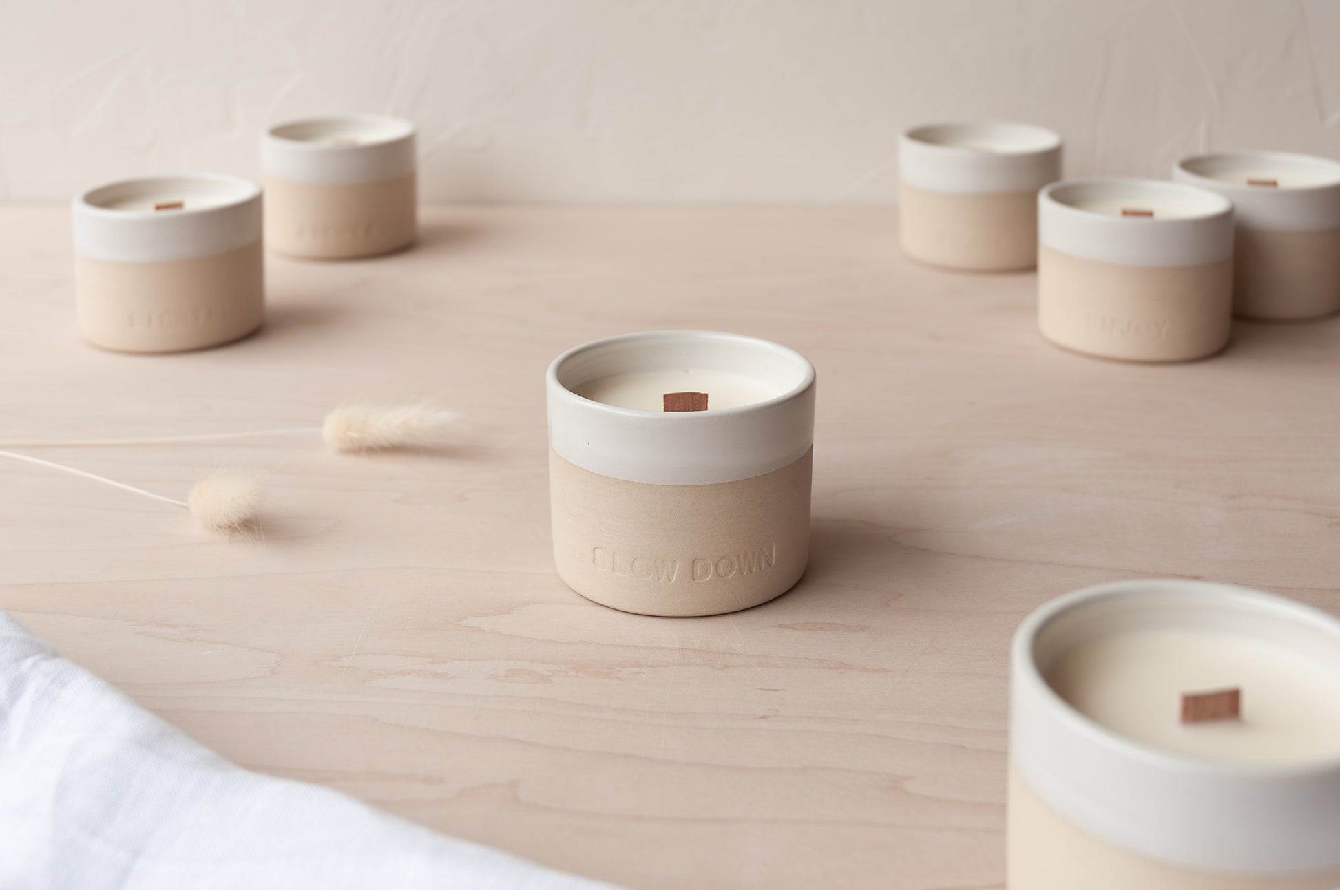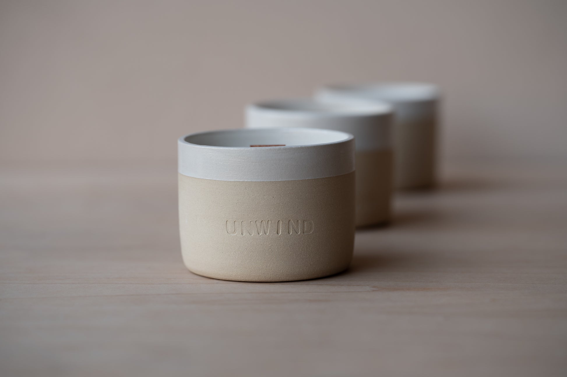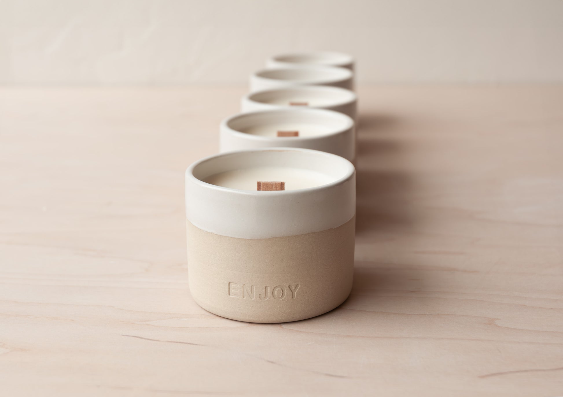 Kaars met houten lont in een handgemaakt keramiek potje. Op het potje staat een ingedrukte tekst. Er zijn 4 tekstjes om uit te kiezen: 'unwind', ‘enjoy’, ‘slow down’ en ‘lichtpuntje’. De potjes zijn gemaakt uit witte klei en voorzien van een witte voedselveilige glazuur. Enkele zijn in spikkelklei.