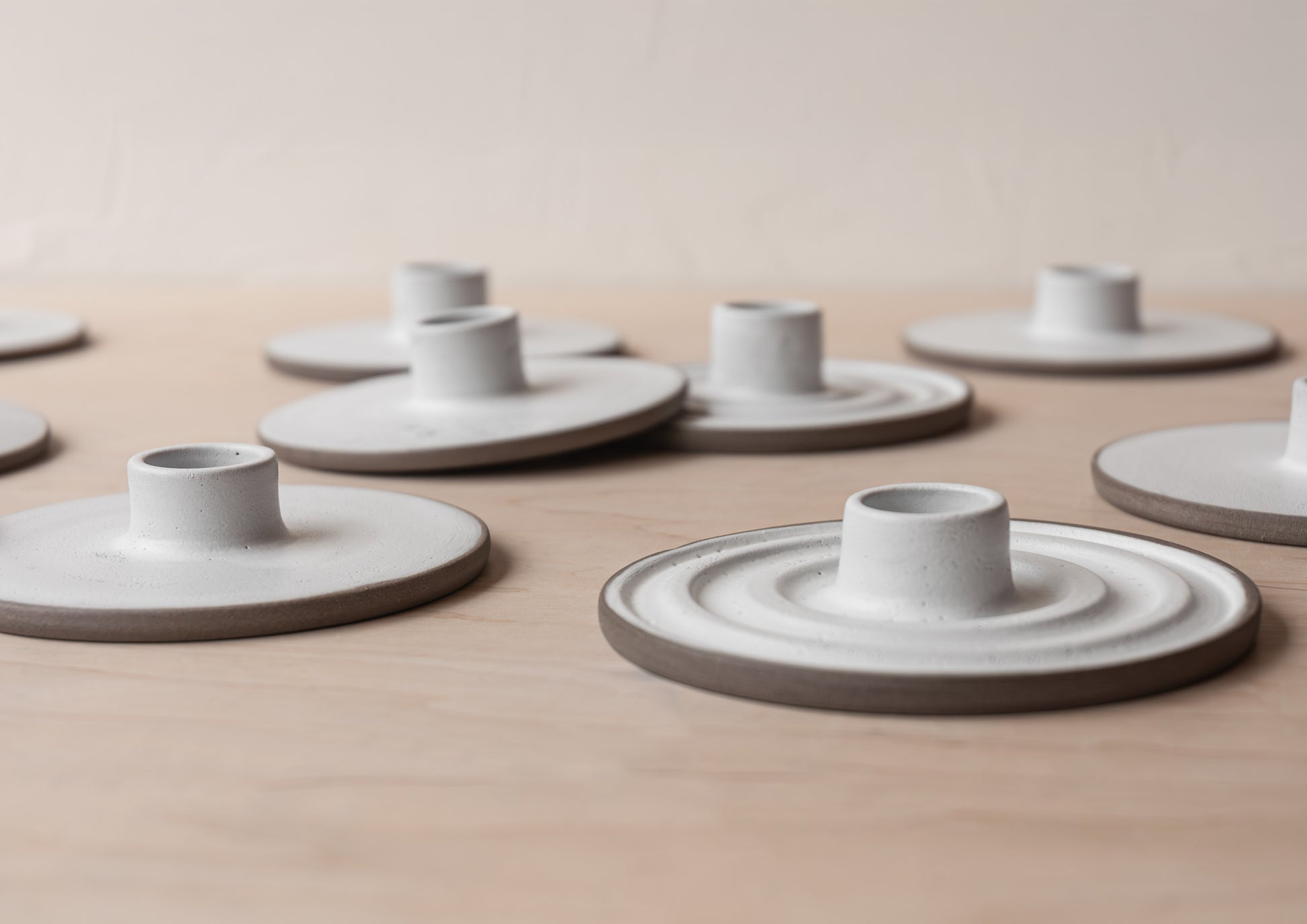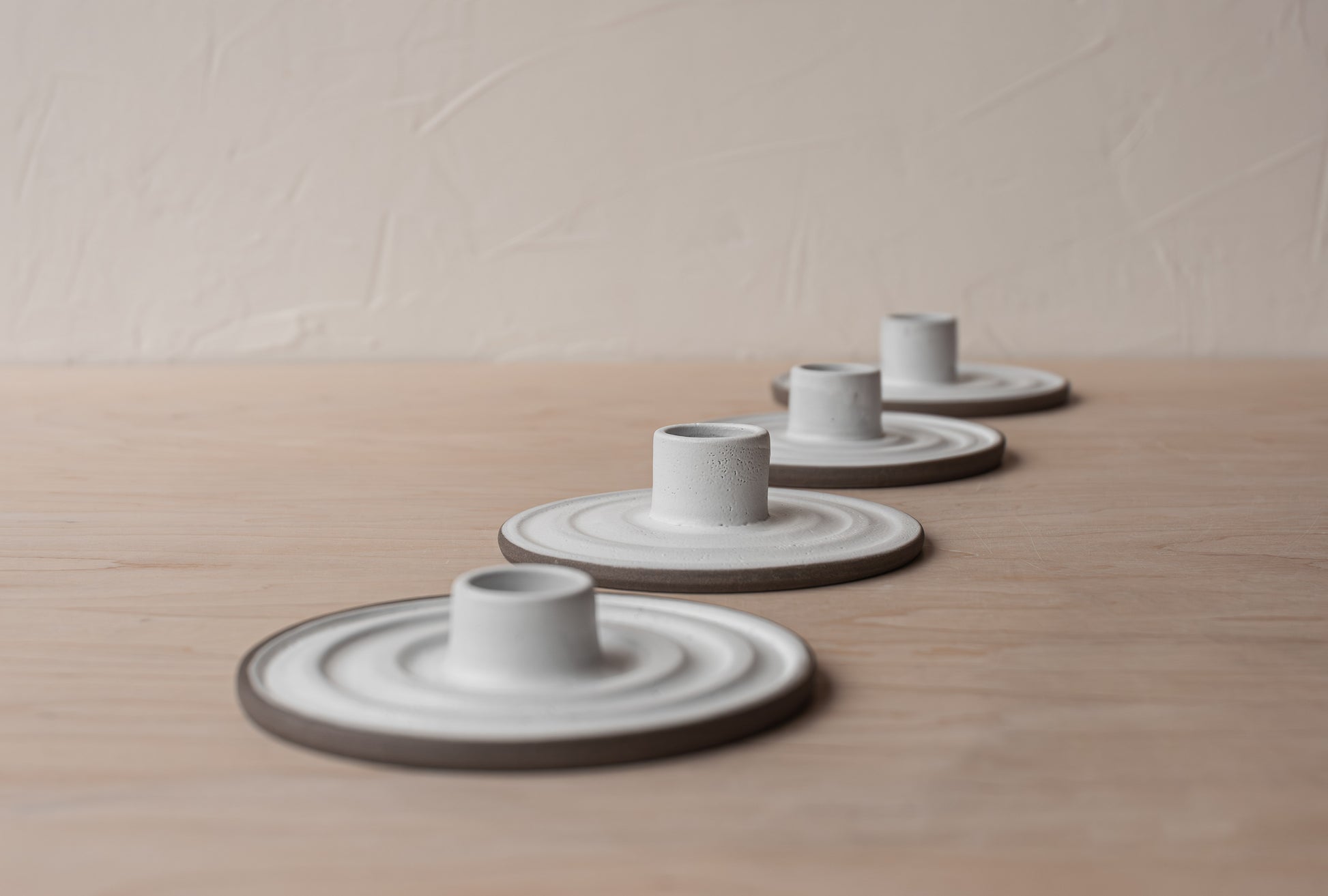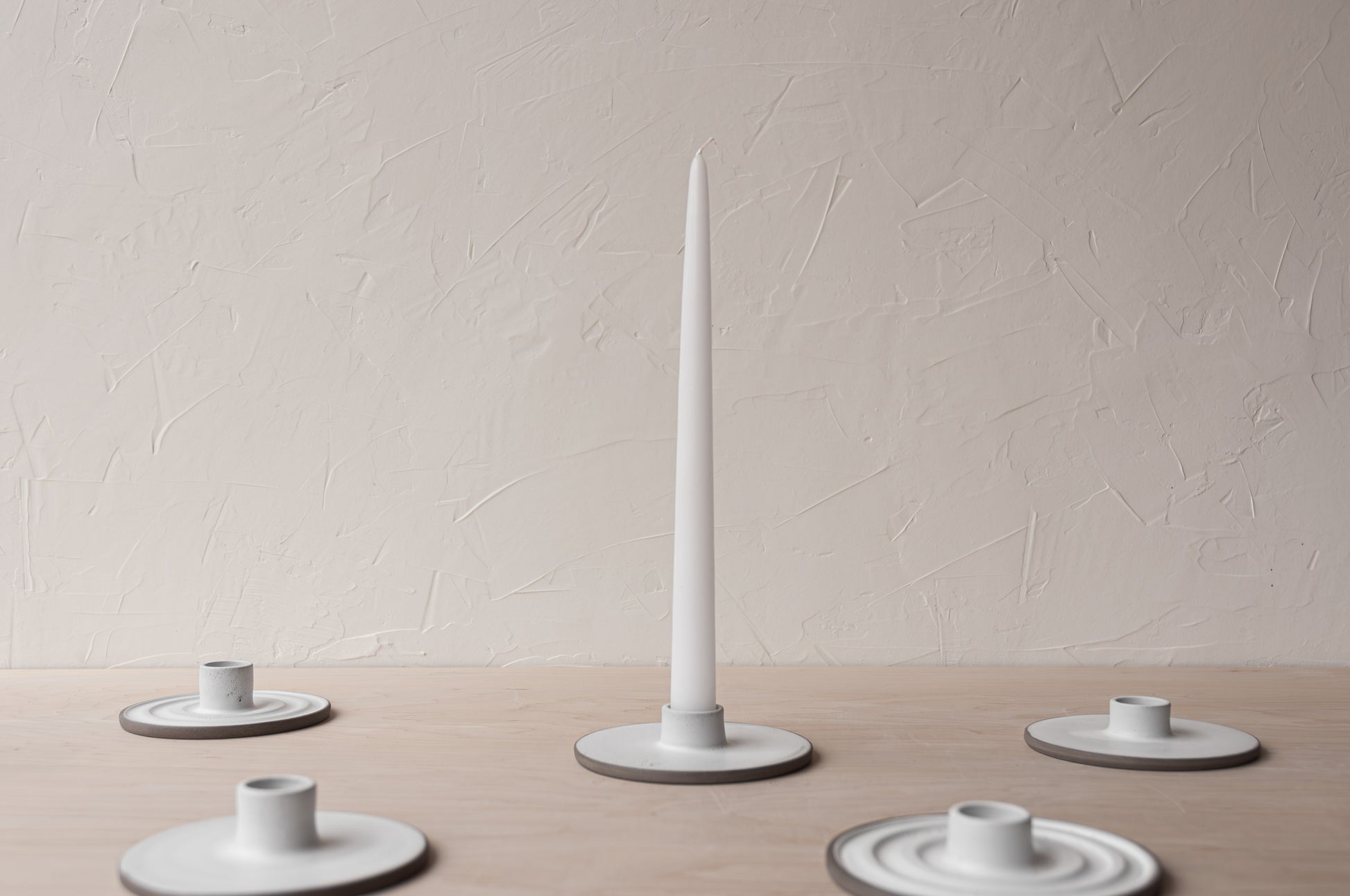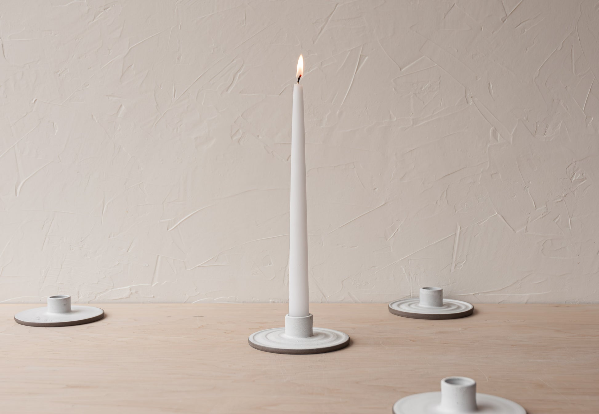 Handgemaakte keramiek kandelaar voor lange kaars, uit grijze klei met mat witte glazuur.