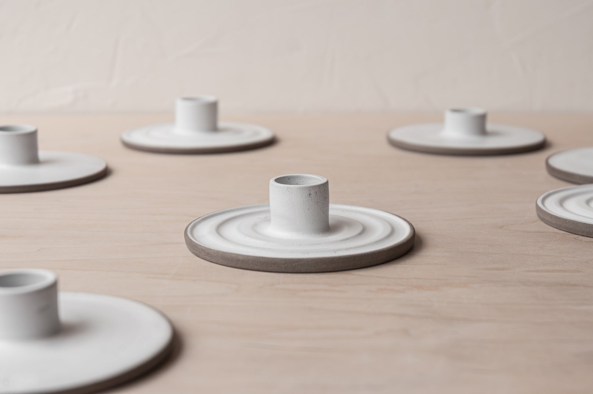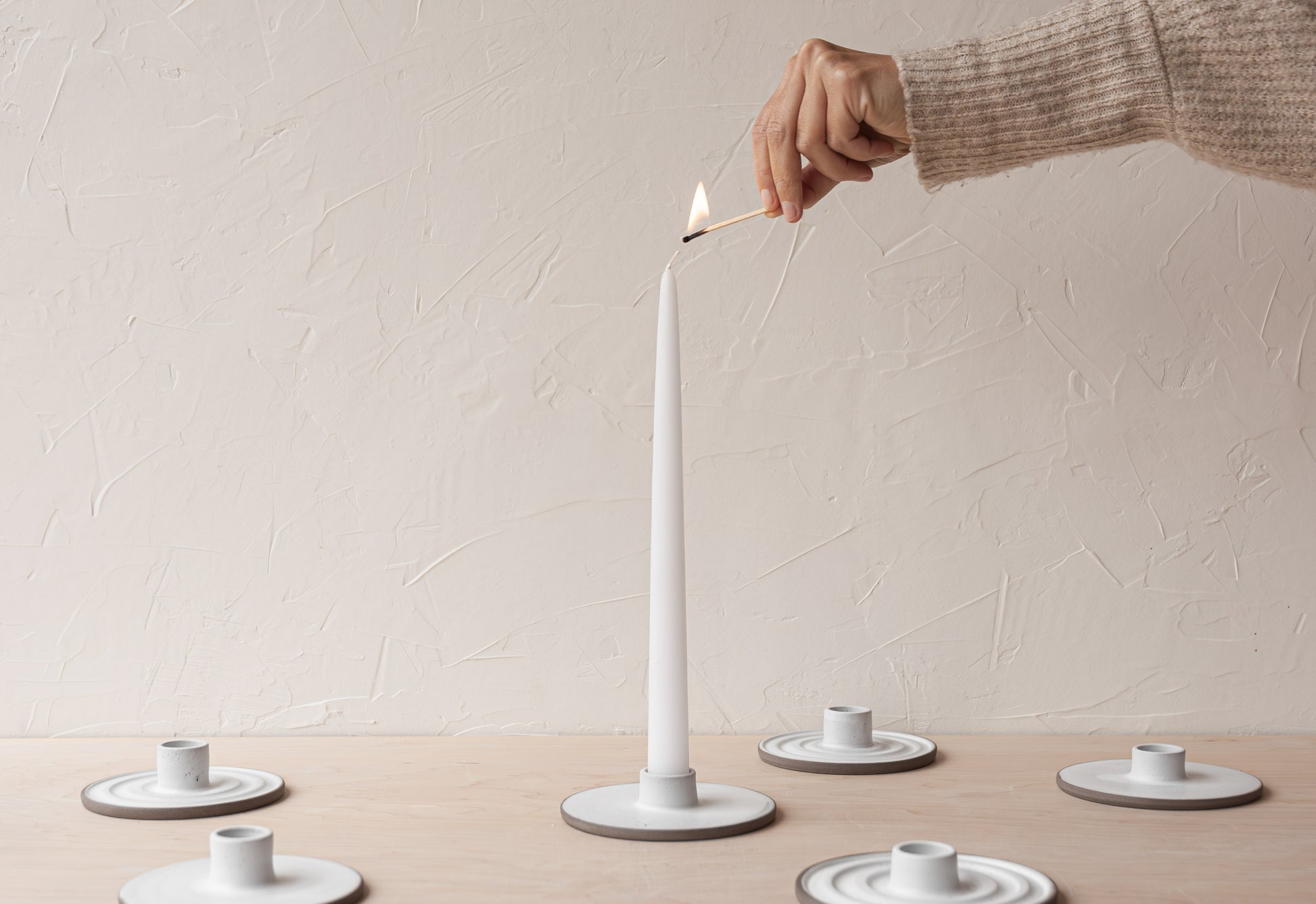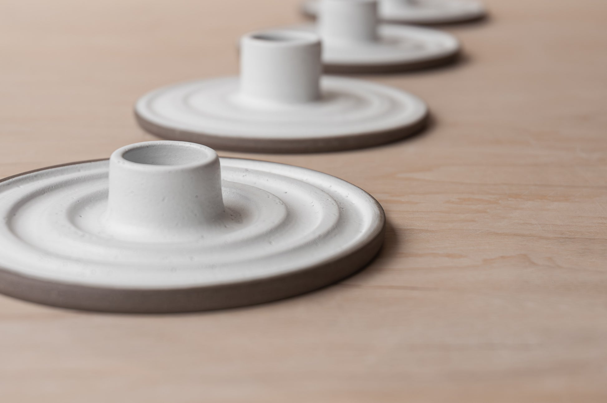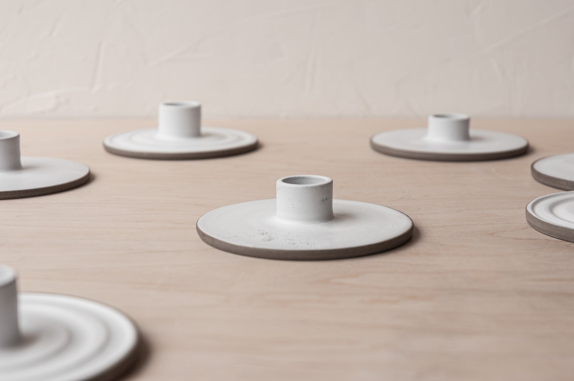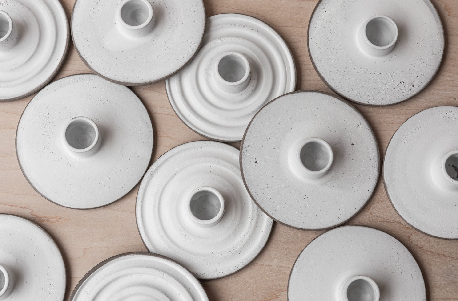 Handgemaakte keramiek kandelaar voor lange kaars, uit grijze klei met mat witte glazuur.