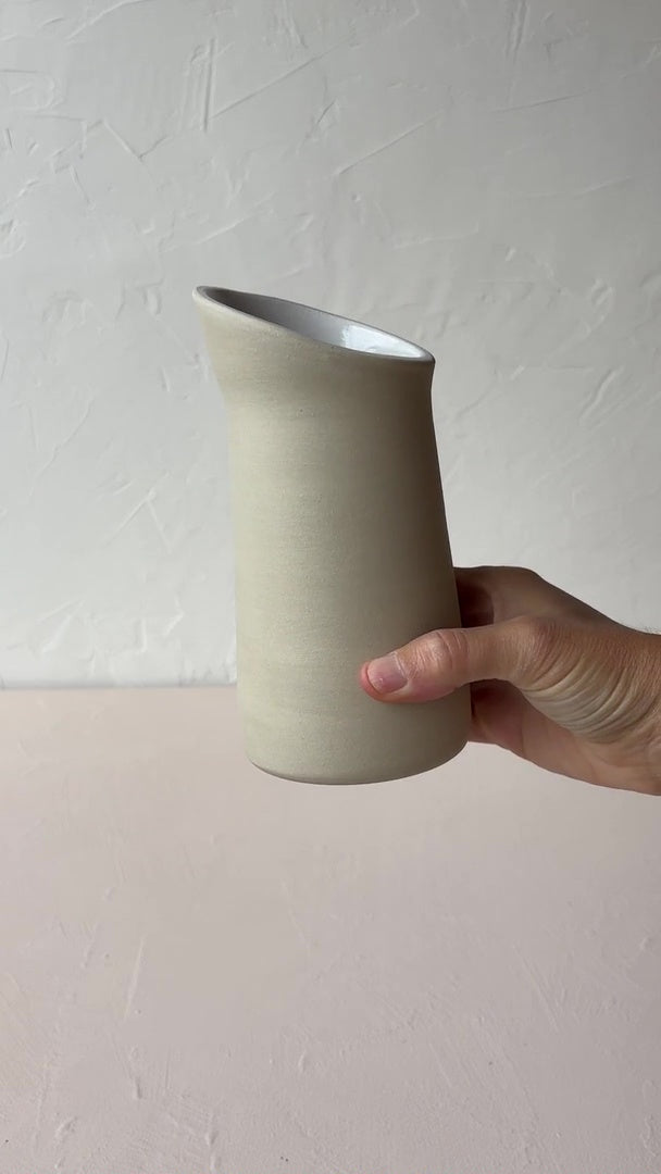 Karaf gemaakt van wit steengoed. Het randje en de binnenkant is voorzien van wit glanzend glazuur, aan de buitenkant blijft de witte klei puur. Deze stuks werden op de draaischijf met de hand gedraaid, elk stuk is dus uniek.