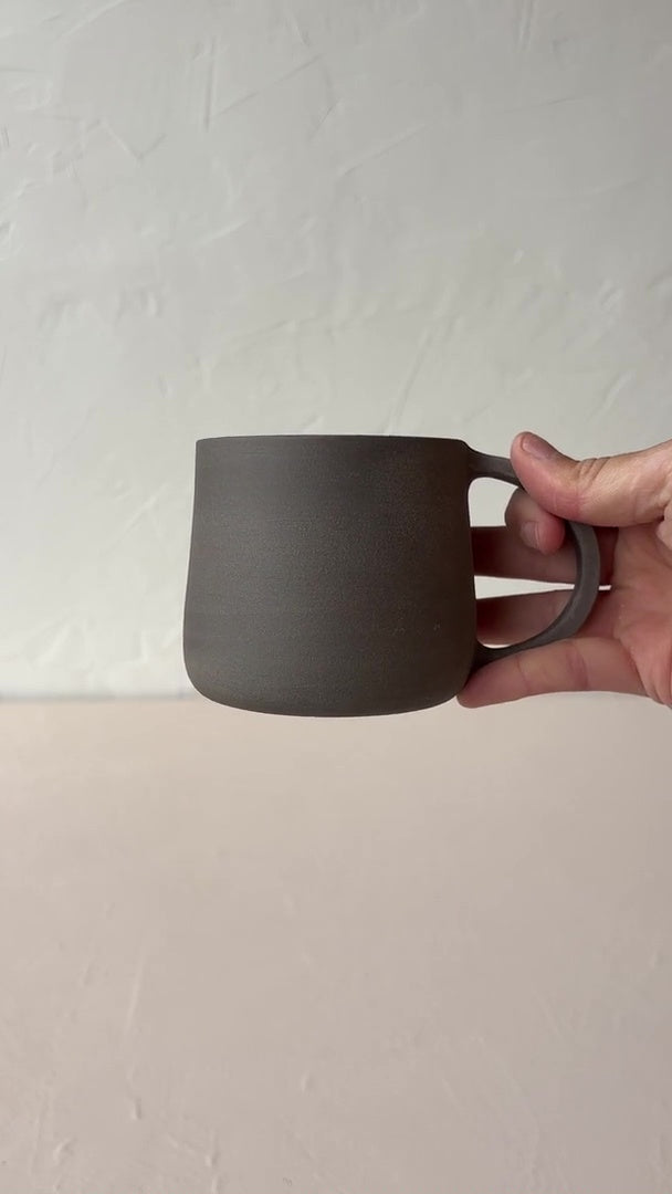 Keramische mok met oor gemaakt van grijs steengoed. Het randje en de binnenkant is voorzien van wit glanzend glazuur, aan de buitenkant blijft de grijze klei puur. Deze stuks werden op de draaischijf met de hand gedraaid, elk stuk is dus uniek.