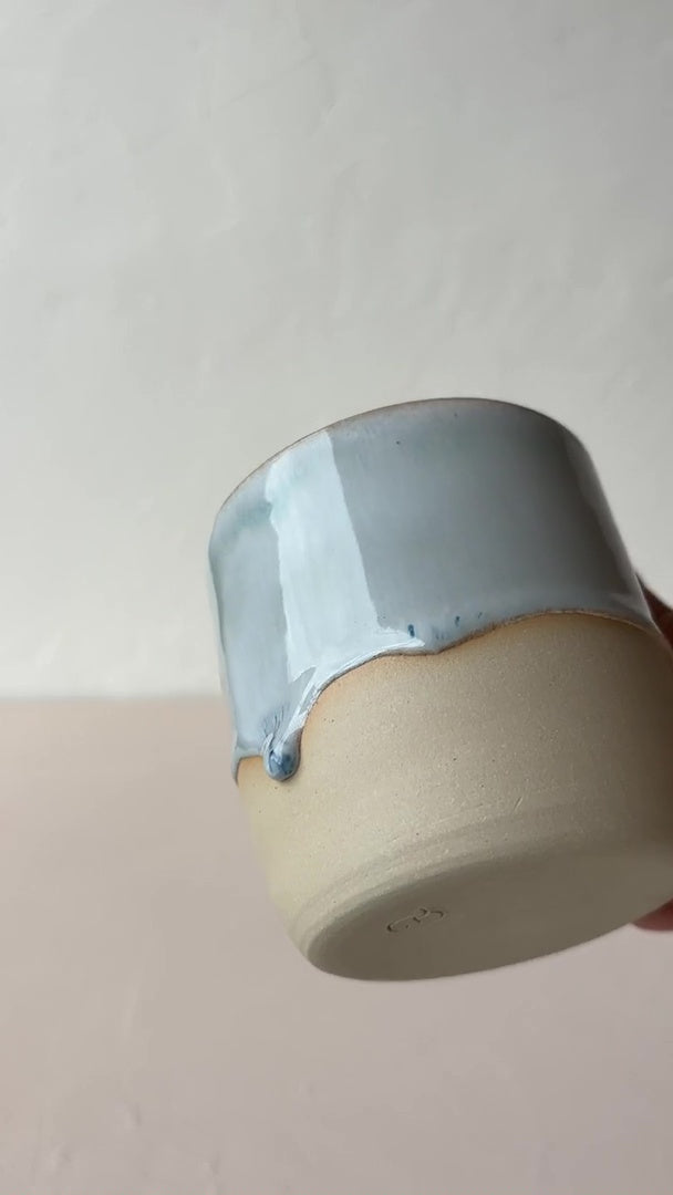 Keramische mok met oor gemaakt van wit steengoed. Het randje en de binnenkant is voorzien van wit glazuur, aan de buitenkant een unieke kleur en drip glazuur. Deze stuks werden op de draaischijf met de hand gedraaid, elk stuk is dus uniek.