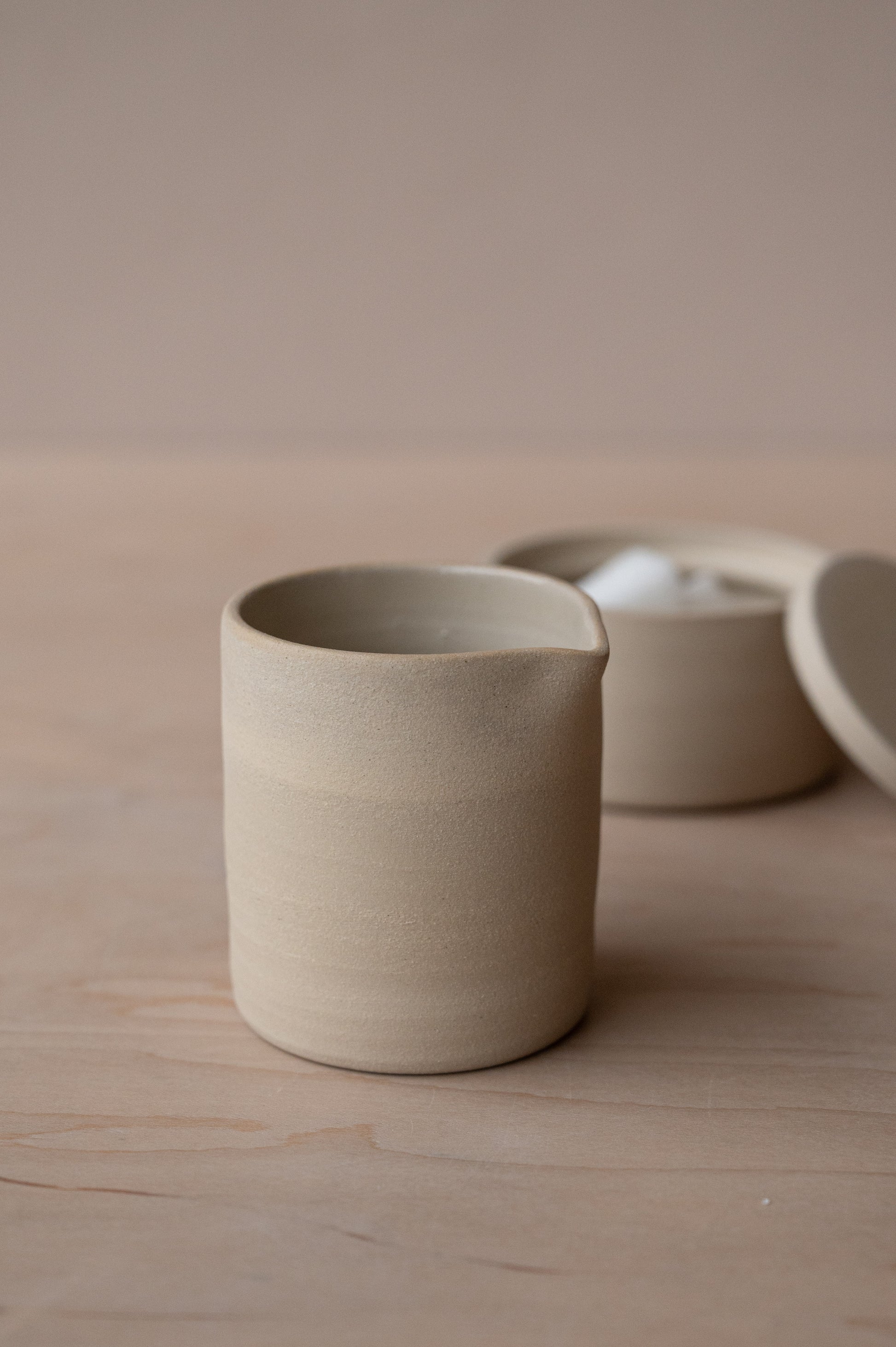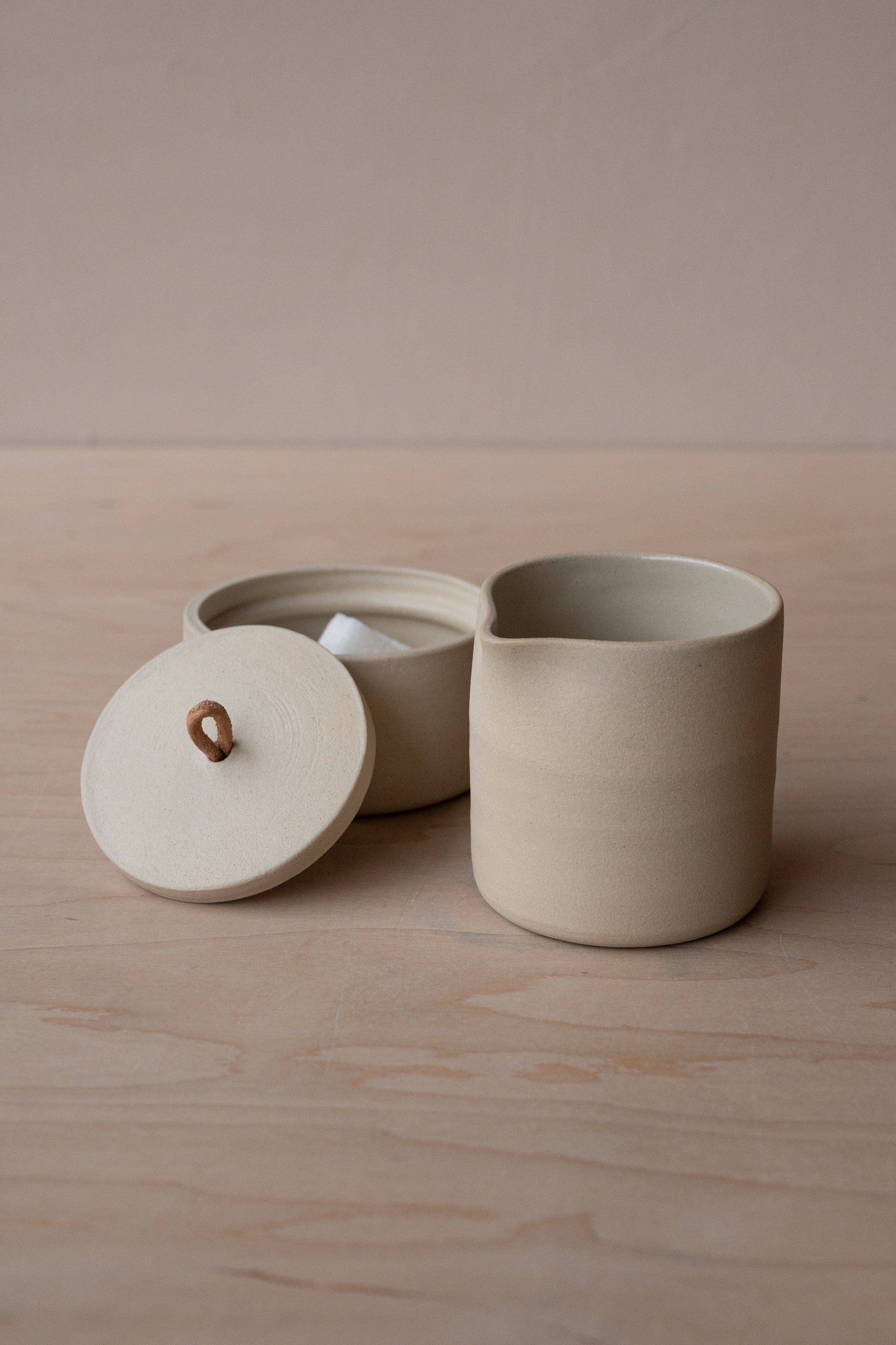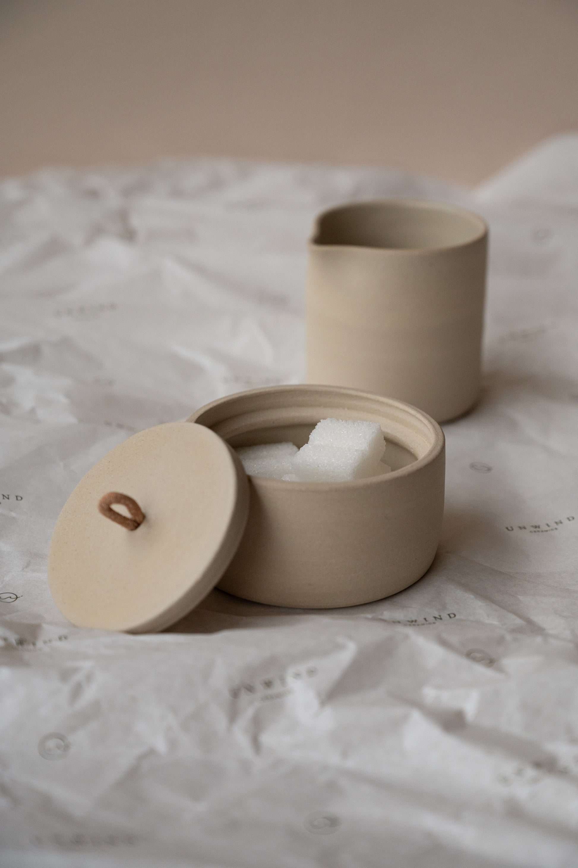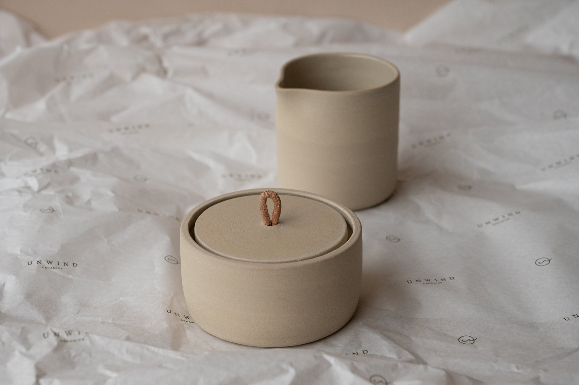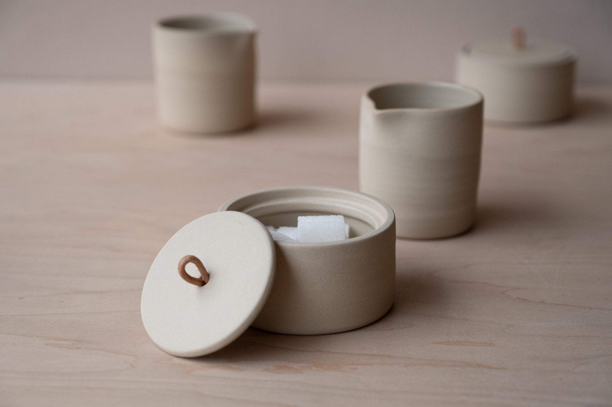 Dit handgemaakt keramieksetje bestaat uit een suikerpotje en melkkannetje. Het werd gedraaid met witte steengoedklei en is binnenin voorzien van transparante glazuur.