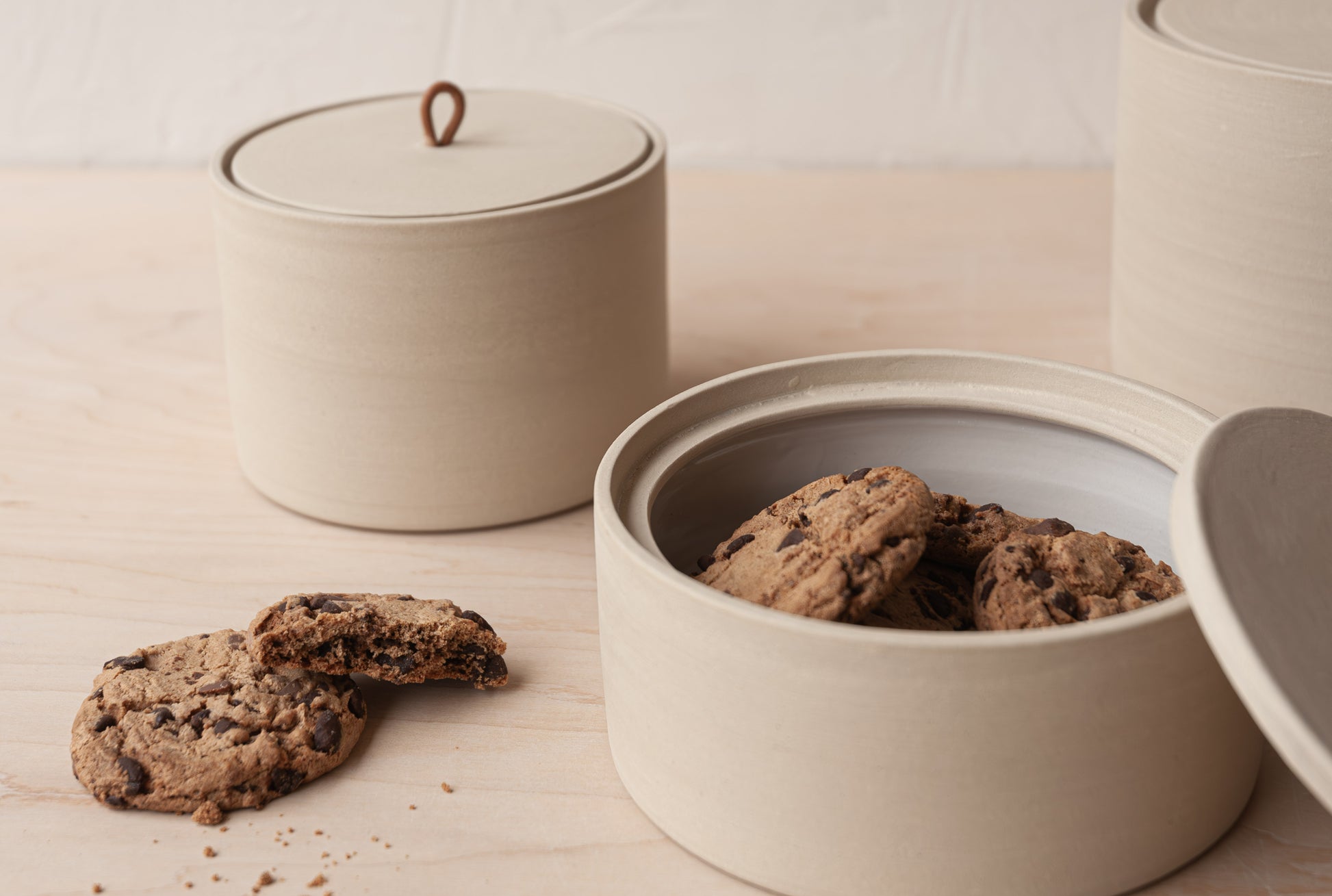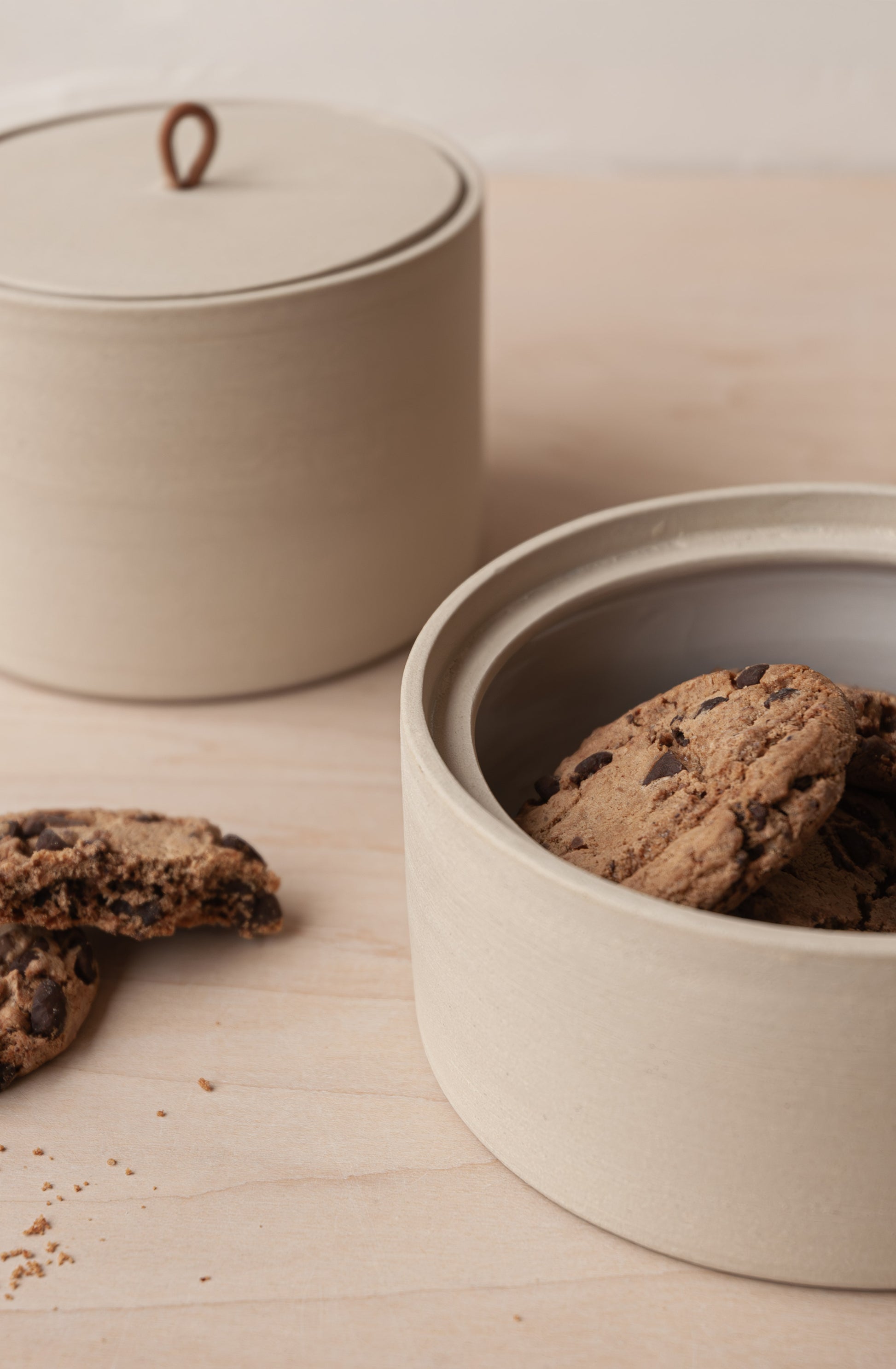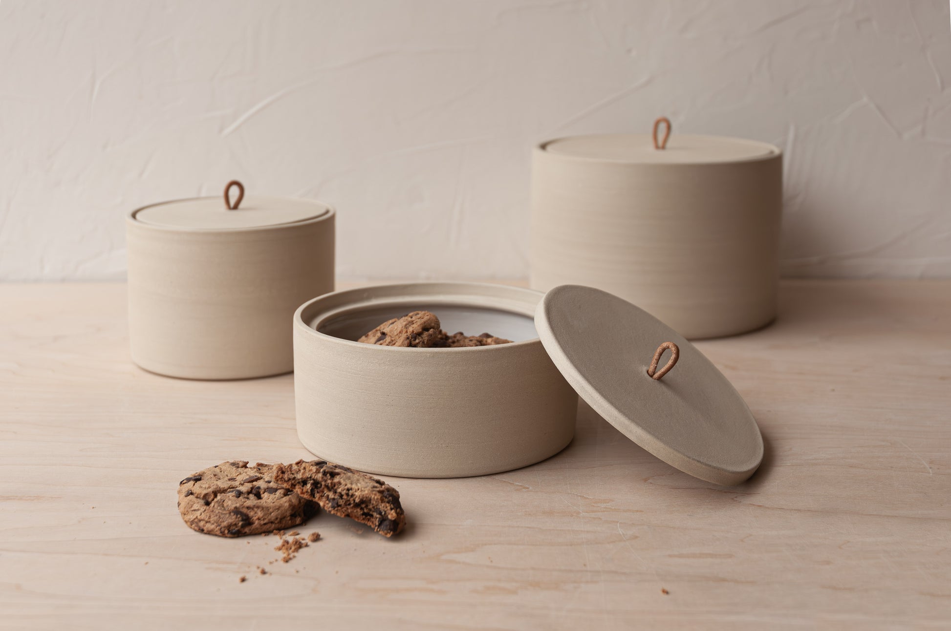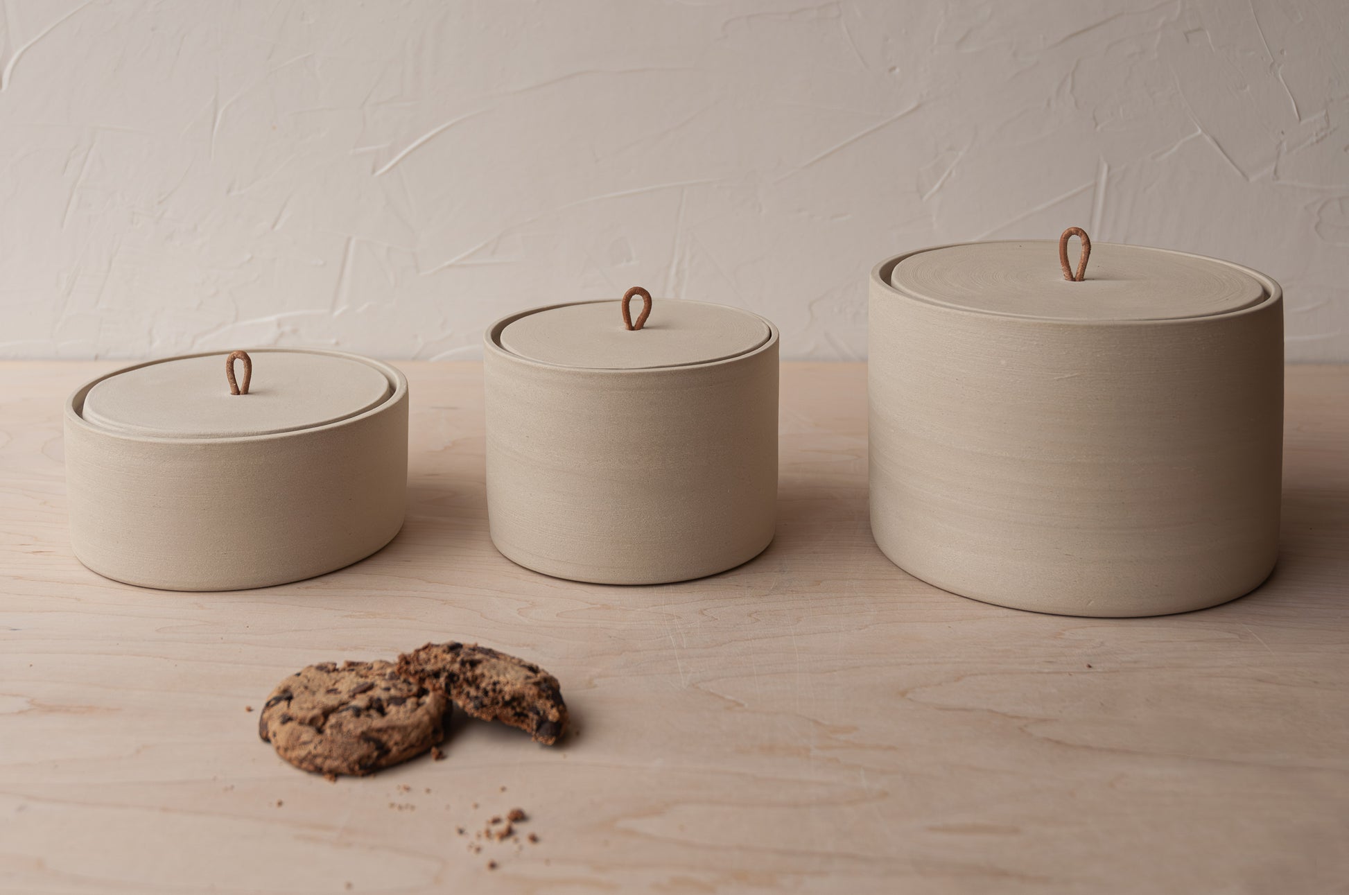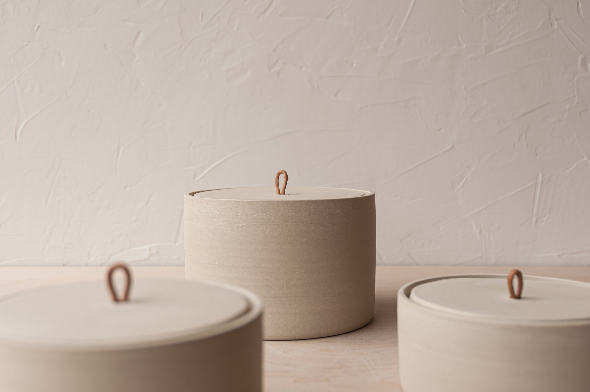 Handgemaakte praktische voorraadpotten van keramiek uit witte klei, verkrijgbaar in verschillende hoogtes. De binnenkant wordt wit geglazuurd, met een deksel en koordje voor een stijlvolle afwerking.
